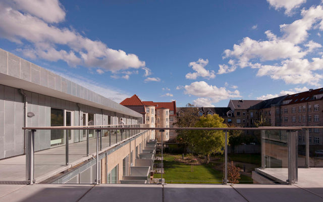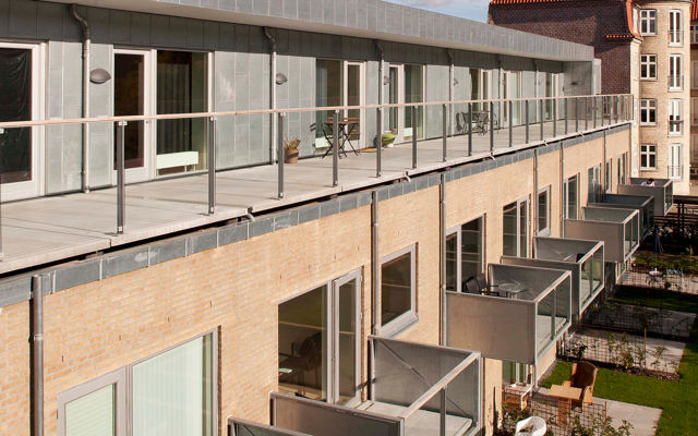 Bygningens tagetage er tilbagetrukket fra facaden; her er opført 12 ungdomsboliger med fælles tagterrasse.